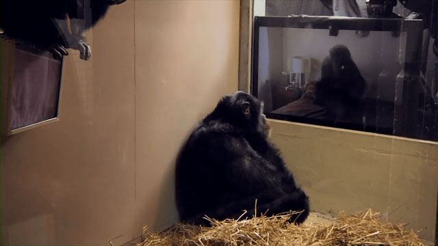 In Apes as Family, the protagonist is a young female chimp, played by a human in an animatronic costume, whose facial expressions are controlled by puppeteers. The young female, like Dorothy in the Wizard of Oz, encounters strange males on an adventure, which eventually leads back "home". The drama is intercut with the chimpsâ responses to the film when it premiered at the zoo. Chimps' were attentive to the film; some sat and watched, others attempted to touch or smell the characters, and other appeared to mimic the action on screen. The project was intended to create a prism for human beings to think about the inner world of chimpanzees. By watching a movie through chimpsâ eyes, we can imagine what they think and feel. Chimps are, after all, our closest relatives. Known for their complex social, cognitive and emotional lives, they also share with us a fascination with cinema.